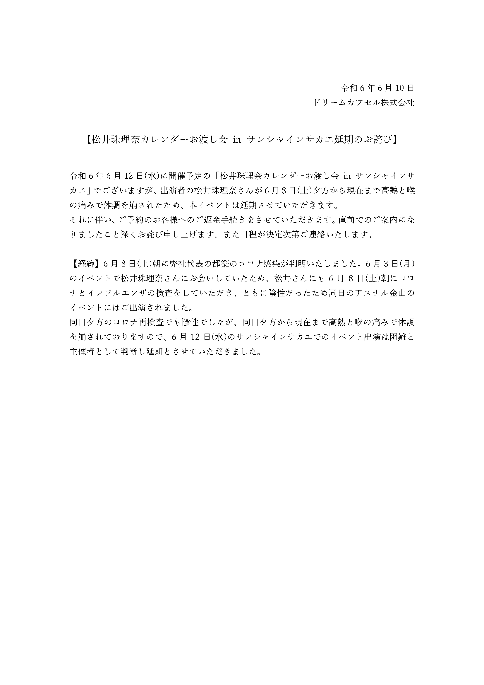 News 延期のお詫び 松井珠理奈カレンダーお渡し会 in サンシャインサカエ トップ お知らせ 延期のお詫び 松井珠理奈カレンダーお渡し会 in サンシャインサカエ 2024.06.10 インフォメーション 延期のお詫び 松井珠理奈カレンダーお渡し会 in サンシャインサカエ 20240610.pdf 一覧へ戻る
