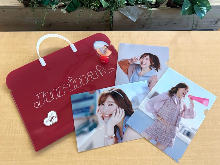 オリジナルクリアファイル 3種、新柄アクリルスタンド(CAPSULE)、ライトアップ台座(JURINAロゴ入:赤)をオリジナルPPキャリングケースに入れてお渡しします。