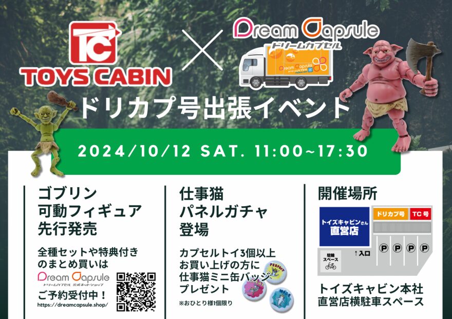 移動カプセルトイ販売カー「ドリカプ号」がトイズキャビンさん直営店でコラボ販売イベントを開催します。