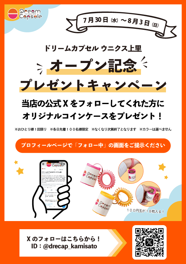 7月30日(水)、「ウニクス上里」にドリームカプセルの店舗がオープンします!
