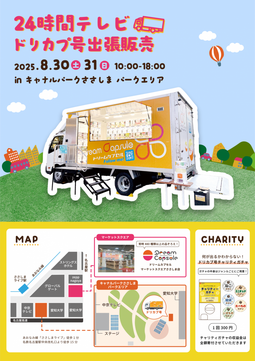 移動カプセルトイ販売カー「ドリカプ号」が『24時間テレビ48~あなたのことを教えて~』に参加します。