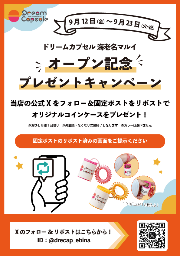 9月12日(金)、「海老名マルイ」にドリームカプセルの店舗がオープンします!